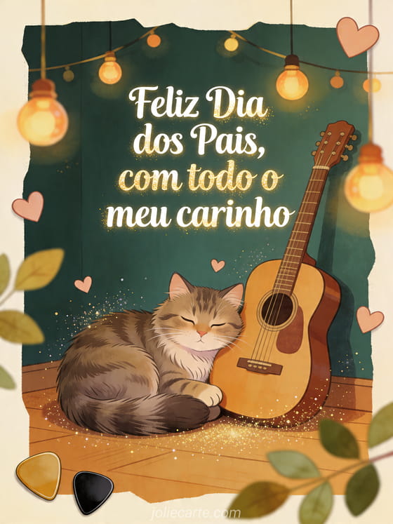 Envie uma imagem terna do Dia dos Pais com uma ilustração aconchegante de livro de histórias: um gato norueguês enrolado ao lado de um violão sob luzes quentes, pequenos corações e formas de folhas. Veja também uma foto dia dos pais, palavras doces para o Dia dos Pais ou poema de Dia dos Pais.