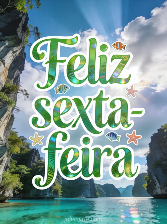 Envie uma imagem engraçada de feliz sexta-feira humor com letras verdes tropicais, peixinhos, estrelas-do-mar e os lagos escondidos de Coron em Palawan. Compartilhe um desejo leve para o fim da semana e veja também feliz sexta-feira coração, bom dia lindo dia de sexta-feira ou bom dia sexta-feira humor engraçado.
