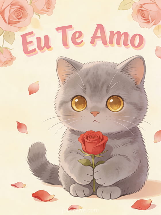 Envie este adorável cartão de Eu Te Amo com um fofo gatinho cinza British Shorthair de olhos dourados redondos segurando uma pequena rosa vermelha entre as patinhas em um fundo creme com pétalas espalhadas. Uma forma terna de dizer eu te amo. Descubra também um cartão de beijos de amor ou uma bela imagem de eu te amo.