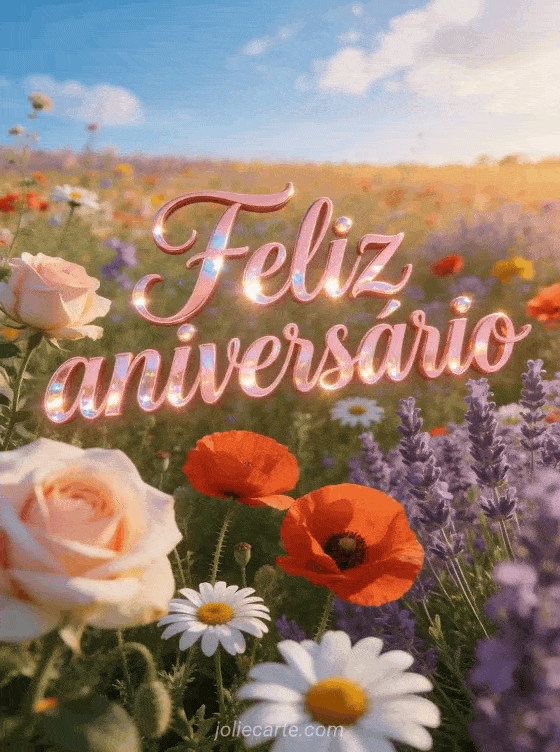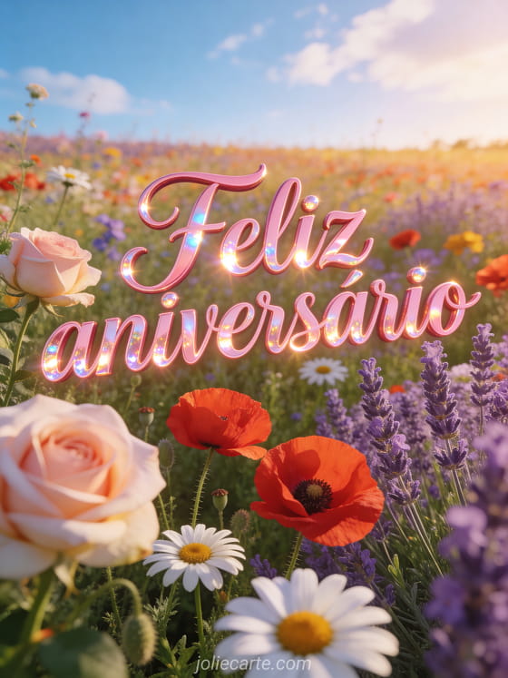 Comemore com um cartão luminoso de aniversário em campo florido sob céu azul, com papoulas, margaridas, lavanda e luz dourada da tarde. Você também pode ver feliz aniversário musical, feliz aniversário imagens e aniversario fofo.