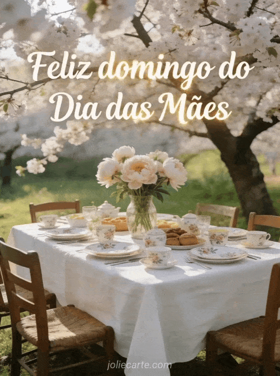 Compartilhe este luminoso cartão com uma elegante mesa de brunch ao ar livre sob flores de cerejeira e peônias. Veja também imagem dia das mães grátis ou cartão dia das mães.
