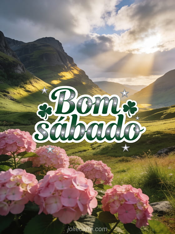 Envie um bonito bom sábado com vales realistas das Highlands escocesas, campinas onduladas, hortênsias rosas e luz dourada atravessando as nuvens. Veja também feliz sábado imagens maravilhosas, feliz sábado à noite gif ou feliz sábado ensolarado.