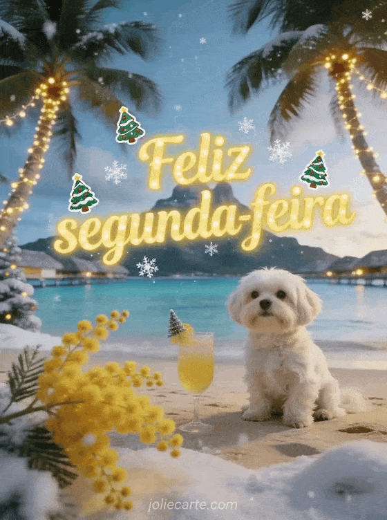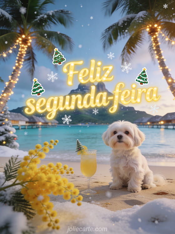 Envie uma imagem grátis de feliz segunda-feira com letras amarelas alegres, stickers de pinheiros nevados e uma lagoa de Bora Bora iluminada por luzes natalinas quentes. Compartilhe um desejo brilhante para começar a semana e veja também animais feliz segunda-feira gif, beijos de segunda-feira gif ou bom dia segunda-feira cartão.