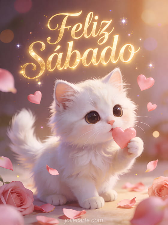 Envie uma doce saudação de feliz sábado com este cartão romântico de um gatinho branco fofo cercado por corações e pétalas de rosa. Você também pode descobrir bom dia e feliz sábado, piadas bom sábado engraçado humor ou bom sábado gif.