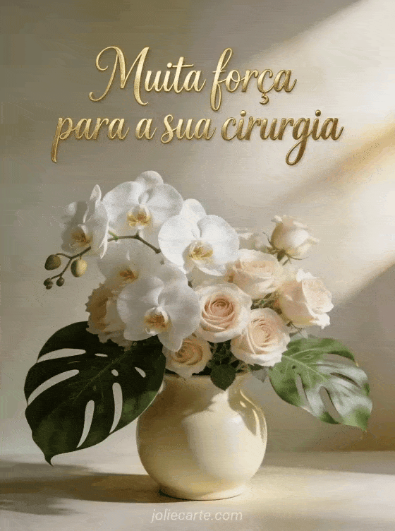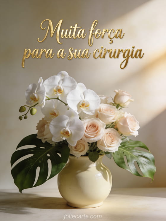 Envie desejos calorosos de força a quem se prepara para uma cirurgia. Este elegante cartão fotorrealista com orquídeas brancas e rosas transmite seu apoio sincero. Descubra também um cartão de força e pensamento, um cartão de apoio e coragem ou um cartão reconfortante de conforto.