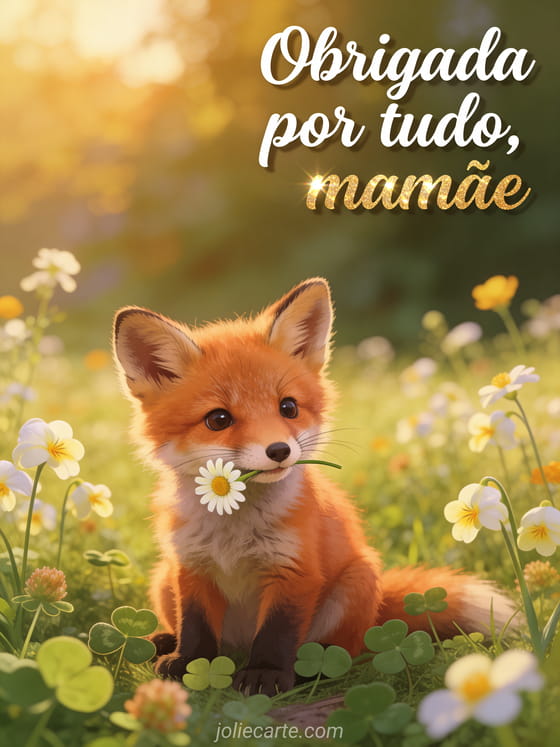 Compartilhe este adorável cartão com uma pequena raposa ruiva segurando uma margarida em um prado banhado em luz dourada. Veja também feliz dia das mães gif ou mensagem para o dia das mães.