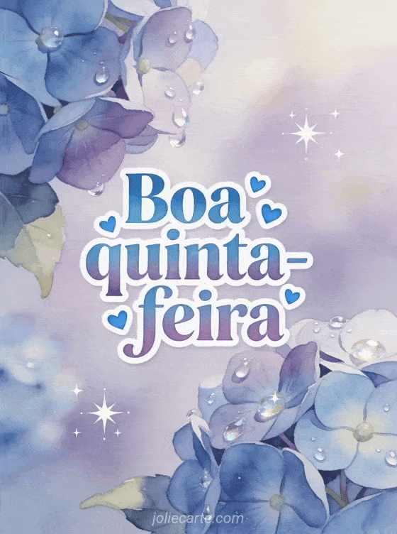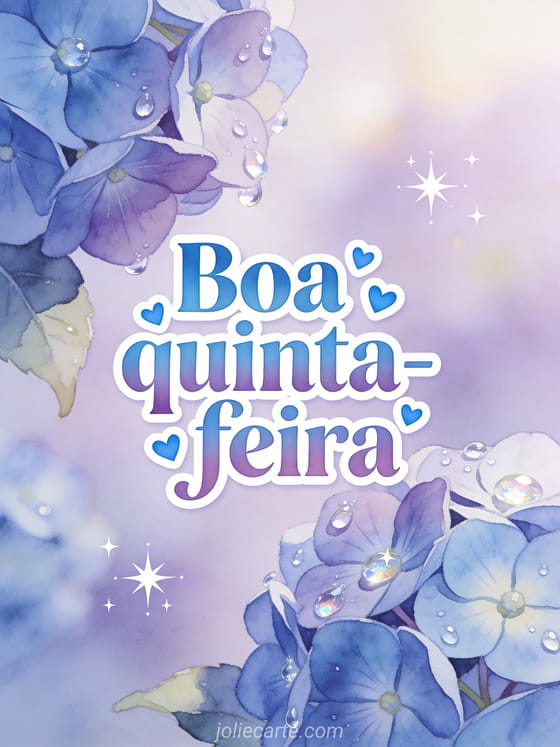 Deseje uma boa quinta-feira com hortênsias azuis refinadas, orvalho cristalino, pequenos corações azuis e um fundo pastel lavanda suave. Veja também imagens de beijos de quinta-feira, feliz quinta-feira muitos beijos gif ou feliz quinta-feira antes do natal.