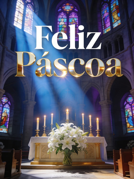 Celebre a Páscoa com este lindo cartão católico com um majestoso interior de catedral, vitrais iluminados pelo sol e lírios brancos. Descubra também um cartão de Páscoa religioso, imagem de Páscoa cristã ou saudação de Páscoa católica.