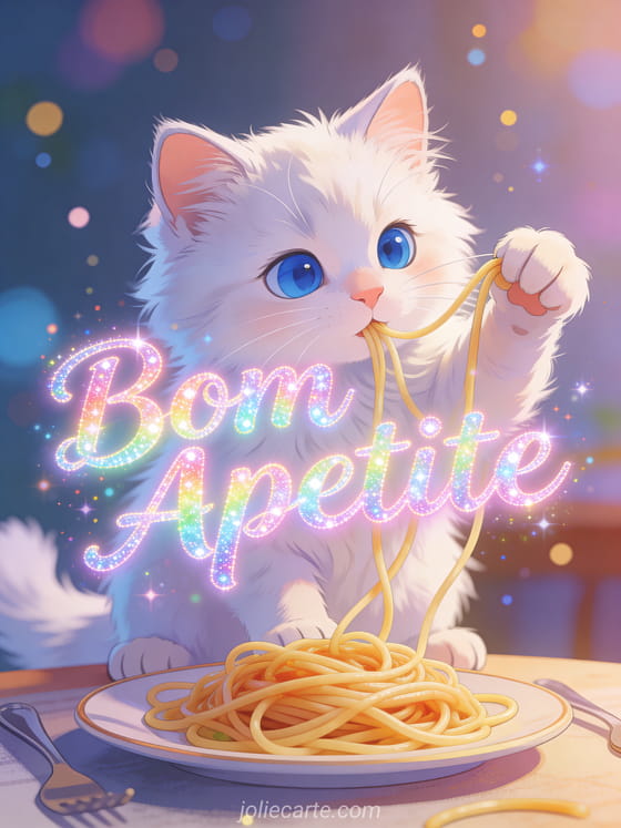 Compartilhe uma colorida imagem animada de bom apetite com este adorável cartão de gatinho. Descubra também um cartão pizza bom apetite ou um cartão desejo-te bom apetite.