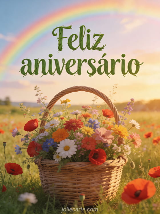 Envie uma bela imagem animada de aniversário com uma cesta de flores silvestres, papoulas e um arco-íris num prado ensolarado. Descubra também feliz aniversário flores gif animado ou gifs animados feliz aniversário.