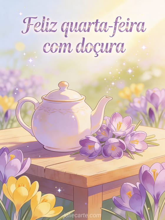 Compartilhe uma saudação doce de quarta-feira com letras leves, brilho sutil, crocus ao redor de um bule de porcelana, poeira brilhante e luz tranquila de primavera. Veja também bom dia é quarta-feira, bom dia minha linda quarta-feira ou bom dia feliz quarta-feira imagem.