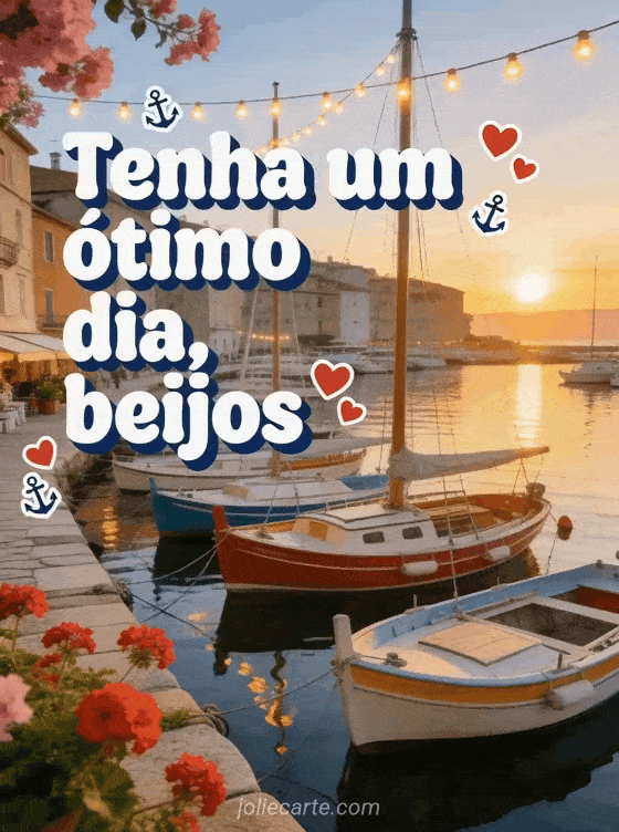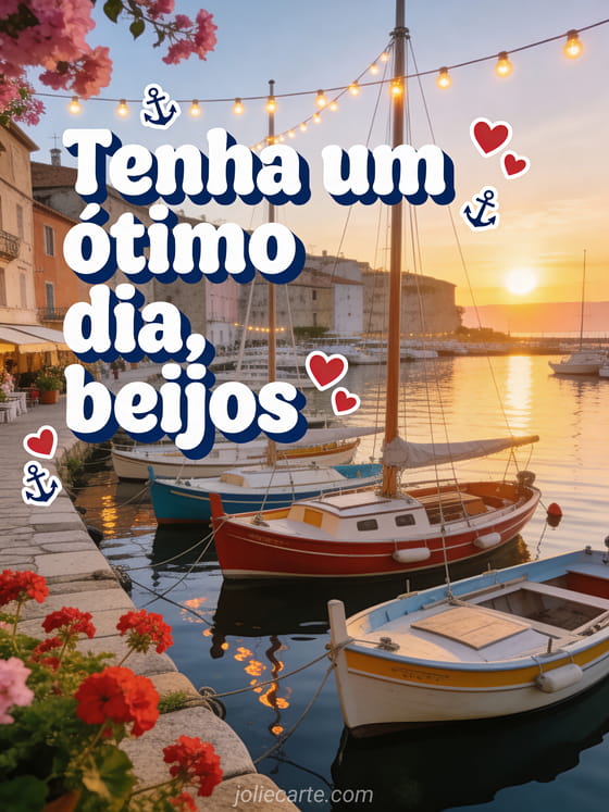 Alegre o dia de alguém com este encantador cartão mediterrâneo com um porto pitoresco, veleiros coloridos, gerânios vermelhos, buganvílias e fios de luzes entre os mastros. Descubra também um cartão animado de bom dia ou um cartão de bom dia com sol.