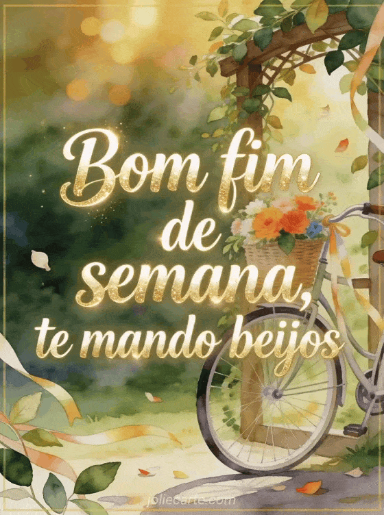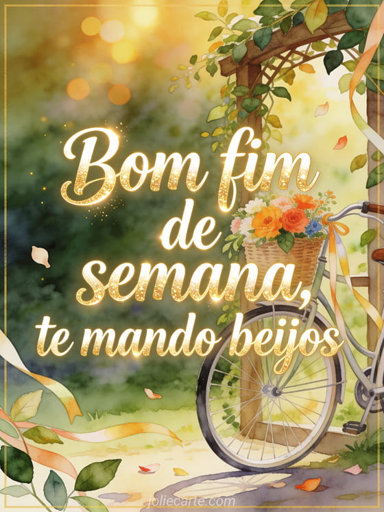 Compartilhe uma mensagem terna de fim de semana com brilho champanhe, uma bicicleta vintage, uma pérgola frondosa e uma cesta de flores coloridas. Veja também bom fim de semana beijos, bom fim de semana muitos beijos gif ou feliz fim de semana beijos gif imagem.