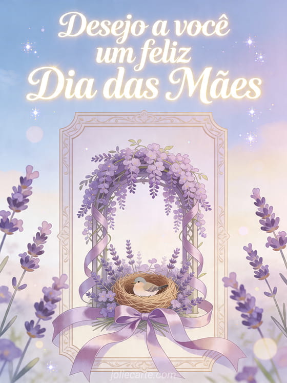 Compartilhe um cartão alegre de Dia das Mães com lettering marfim, um arco ilustrado de lavanda, um ninho de pintarroxo entre flores roxas, fitas de cetim e brilho sutil. Veja também bom dia e feliz Dia das Mães, um verso do Dia das Mães ou uma mensagem de feliz Dia das Mães.