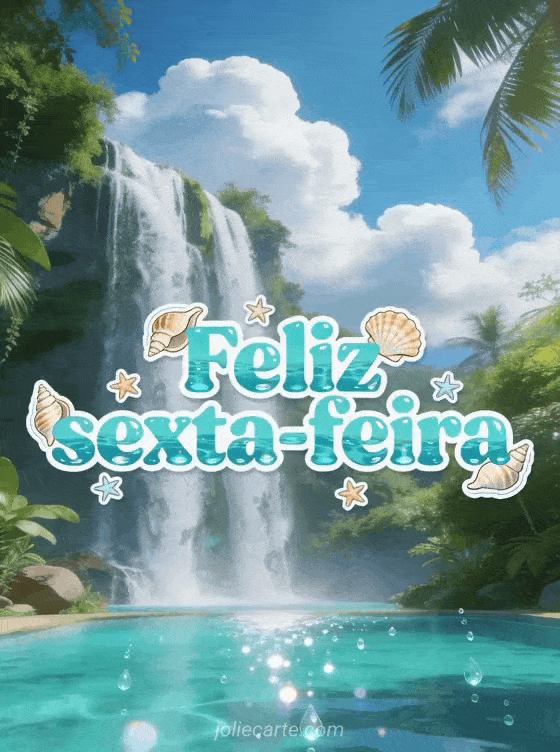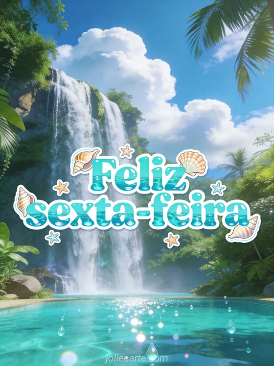 Compartilhe um cartão exuberante de feliz sexta-feira com letras arredondadas turquesa, reflexos de água, conchas, pequenas estrelas-do-mar, uma cachoeira majestosa caindo em uma piscina natural esmeralda, céu azul luminoso, nuvens brancas fofas e vegetação tropical. Veja também feliz sexta-feira bom fim de semana humor, feliz sexta-feira café imagem ou mensagem para desejar feliz sexta-feira aos muçulmanos.