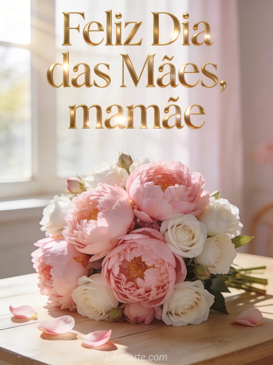 Compartilhe este lindo cartão dia das mães com um suntuoso buquê de peônias rosas e rosas brancas à luz da manhã. Veja também cartão dia das mães gratuito ou cartão de mãe dia.