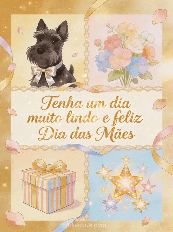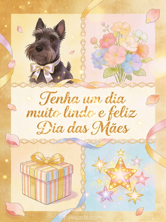 Compartilhe imagens do feliz Dia das Mães em uma ilustração de quatro painéis com um terrier escocês, laço de seda, flores pastel, presente listrado, fitas, pétalas e estrelas decorativas. Veja também poema de Dia das Mães, linda frase feliz Dia das Mães para uma mãe ou poesias para o Dia das Mães.