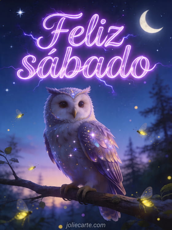 Envie uma mística mensagem de feliz sábado com este cartão encantador de uma coruja brilhante sobre um galho sob uma lua crescente e um céu estrelado. Você também pode descobrir bom dia e feliz sábado, imagem grátis feliz sábado beijos ou bom dia e bom sábado.