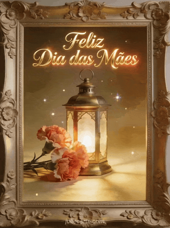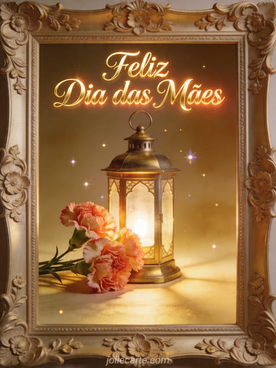 Envie imagens grátis Dia das Mães com caligrafia champanhe, brilho acolhedor e uma lanterna de latão fotorrealista ao lado de cravos frescos dentro de uma moldura decorativa. A luz dourada e os pequenos brilhos tornam este cartão convidativo e festivo. Veja também mensagens de Feliz Dia das Mães, imagens para o Dia das Mães ou foto para o Dia das Mães.