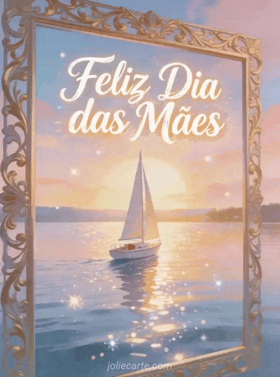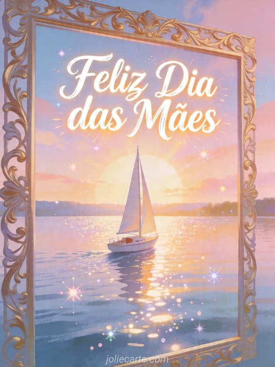 Envie imagens grátis do Dia das Mães com uma saudação branca e leve, um panorama de lago brilhante e um veleiro gracioso sob um amanhecer em tons pastel. Este cartão ilustrado e sereno leva calma, luz e carinho ao dia. Veja também Dia das Mães texto, cartões de Dia das Mães ou cartão com coração Dia das Mães.