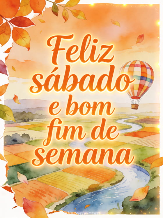 Compartilhe uma saudação alegre de sábado e fim de semana com letras laranja, um balão de ar quente listrado, campos em mosaico, um rio sinuoso e céu aberto. Veja também feliz sábado e fim de semana imagem, feliz sábado flores imagens ou imagens brilhantes feliz sábado.