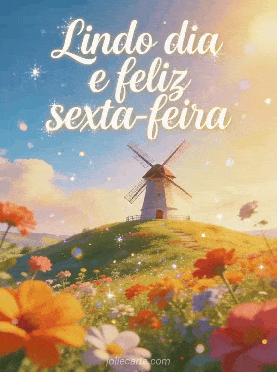 Compartilhe uma linda imagem de feliz sexta-feira com letras em marfim, uma colina ensolarada, um moinho clássico e flores brilhantes com luz suave cintilante. Veja também boa sexta-feira sol gif, boa sexta-feira imagem com flores ou feliz sexta-feira invernal gif.