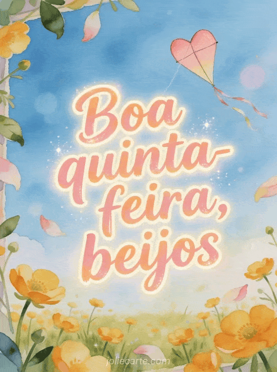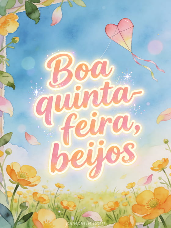 Compartilhe boa quinta-feira, beijos com letras rosa pêssego, uma pipa em forma de coração sobre uma campina ensolarada de ranúnculos e pétalas cruzando a borda. Veja também bom dia quinta-feira imagem, feliz quinta-feira com citação ou feliz quinta-feira gato gif.