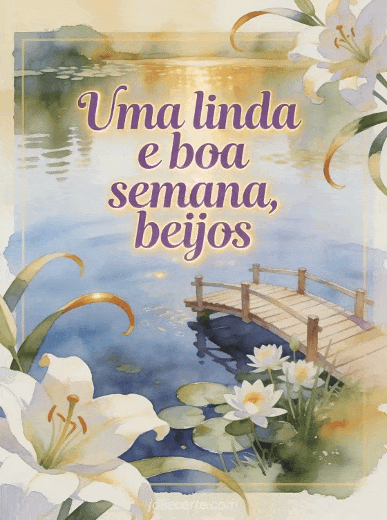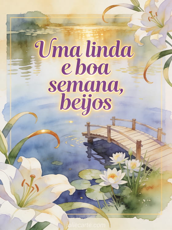Envie um cartão suave com um tranquilo lago de nenúfares, uma pequena ponte de madeira e nenúfares frescos em luz luminosa. Descubra também uma boa semana beijos imagem grátis, uma boa semana gif beijos ou uma boa semana para você também beijos.