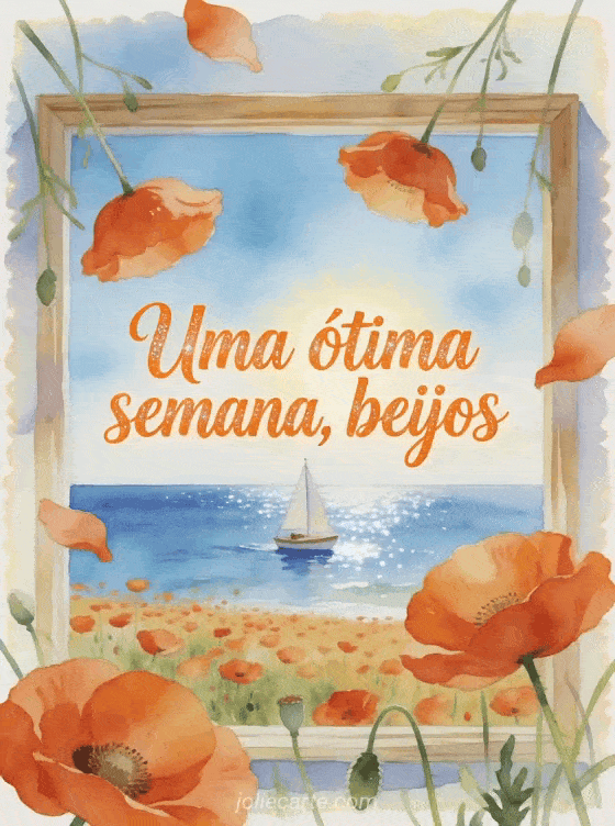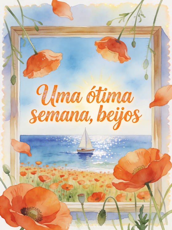 Deseje uma ótima semana com letras laranja iluminadas, papoulas à beira da costa e um pequeno veleiro sobre a água azul brilhante. Veja também um cartão de boa semana muitos beijos imagem, um cartão de boa semana gif animado gif ou um cartão de feliz segunda-feira boa semana beijos.