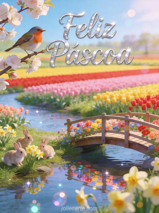 Celebre a Páscoa com este encantador cartão animado gratuito com um dom-fafe empoleirado em um galho florido ao lado de um riacho de Keukenhof com campos de tulipas em vermelho, rosa e amarelo, uma passarela de madeira e coelhinhos entre narcisos. Descubra também cartes virtuelles joyeuses paques gifs joyeuses paques.
