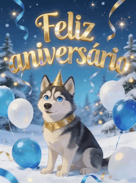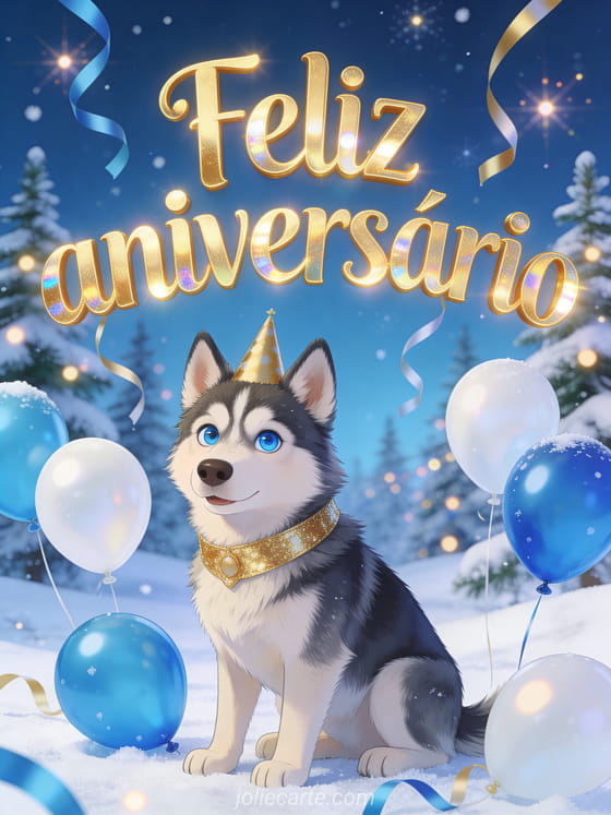 Este lindo cartão de aniversário animado para homens mostra um husky de olhos azuis intensos com uma coleira dourada de festa, cercado de balões azuis e brancos e serpentinas contra uma paisagem nevada com pinheiros. Um cartão alegre e encantador para o aniversário de qualquer homem. Descubra também um cartão de aniversário engraçado para homem ou um lindo cartão de aniversário para homem grátis.