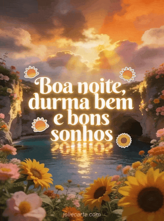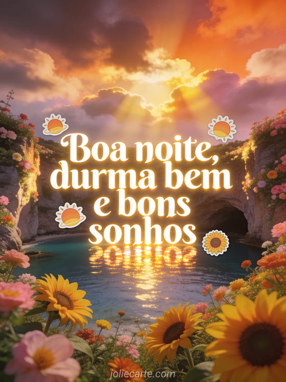 Compartilhe uma calorosa boa noite com este lindo cartão com girassóis em primeiro plano diante de uma baía secreta cercada de falésias floridas com raios de luz dourada entre nuvens dramáticas. Descubra também uma mensagem de boa noite engraçada, fotos de boa noite ou um pensamento de boa noite.