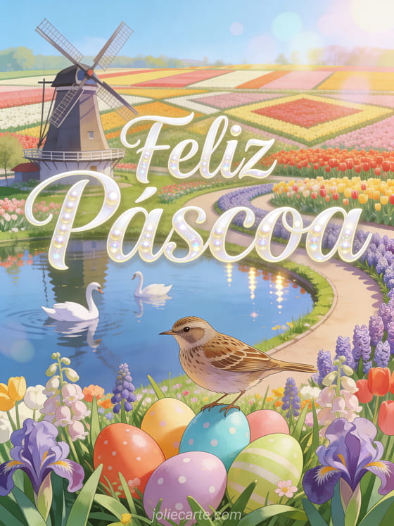 Compartilhe um lindo cartão de Feliz Páscoa com um pipit saltando entre ovos coloridos em um jardim de tulipas. Descubra também um cartão de Páscoa grátis ou modelo de cartão de Páscoa.