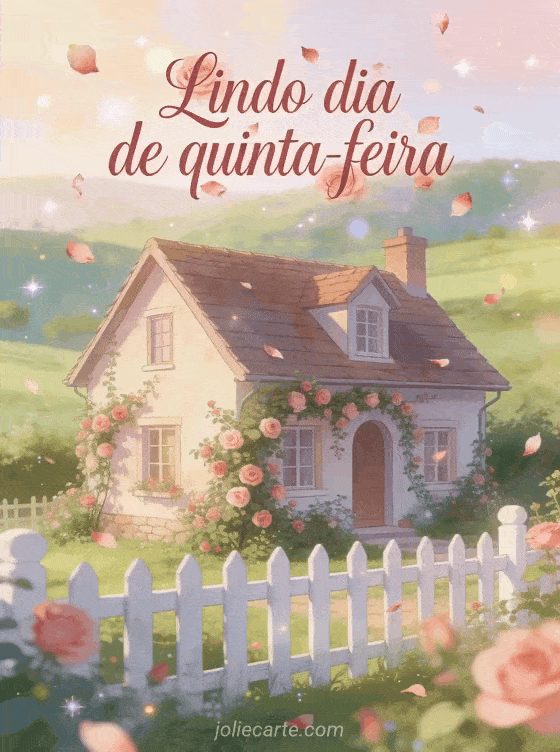 Compartilhe uma saudação sonhadora de quinta-feira com um encantador chalé rodeado de rosas trepadeiras e uma cerca branca. Confira também um feliz quinta-feira zen ou um ótima quinta-feira.