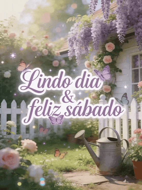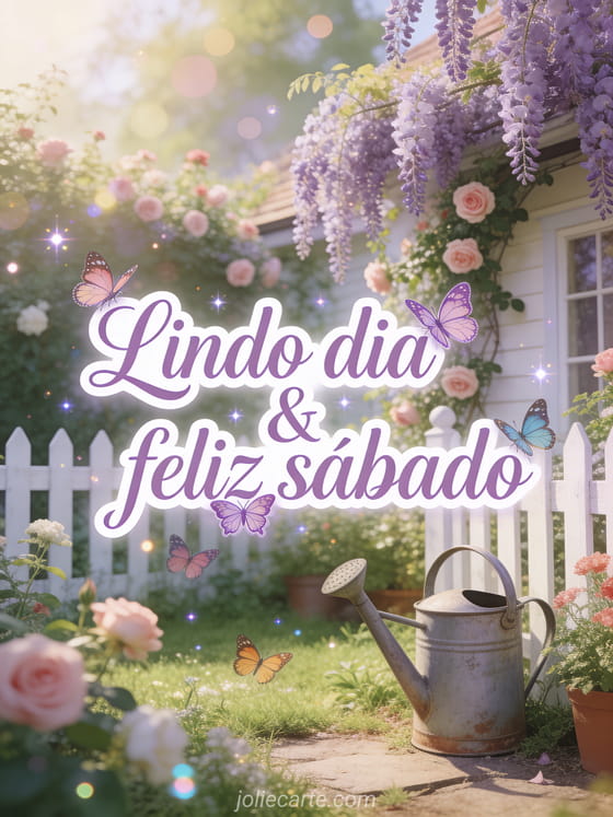 Compartilhe uma saudação encantadora de sábado com um jardim de casa de campo, rosas trepadeiras, glicínia, cerca branca e borboletas coloridas na luz da manhã. Você também pode enviar bom dia sábado cartão ou sábado beijos gifs.