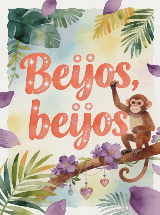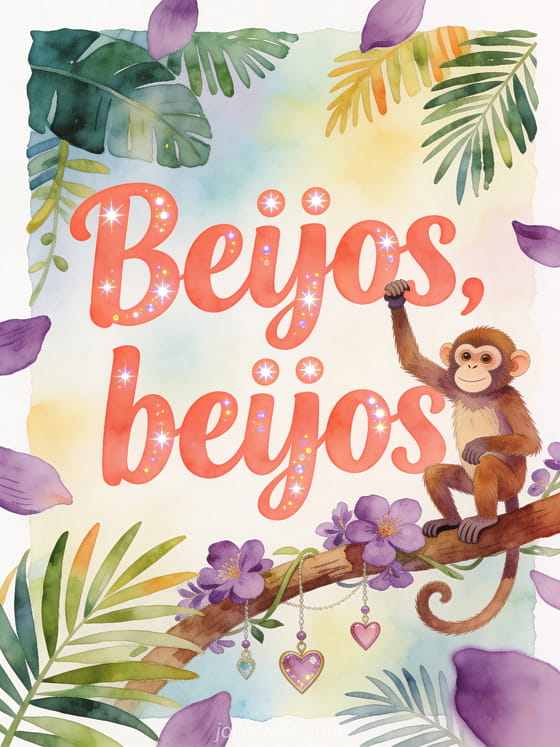 Envie uma saudação divertida de beijos com letras coral, um galho de selva, um macaco, flores violetas, pingentes de coração e folhas tropicais. Veja também envio de beijos imagem, um marmota beijos gif ou uma imagem beijos grátis.