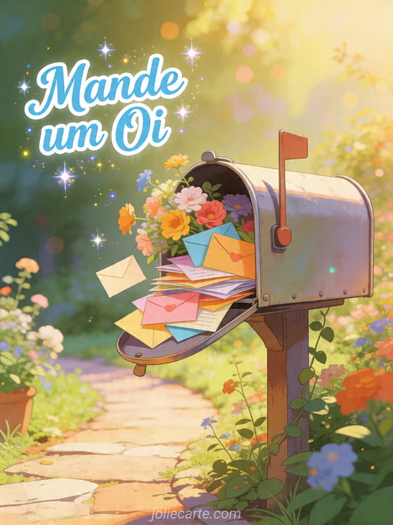 Compartilhe este encantador cartão de mande um oi com uma caixa de correio vintage, cartas coloridas, flores e um clima caloroso para enviar carinho. Você também pode descobrir olá, olá mamãe e bom dia ao seu namorado.