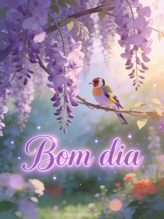 Compartilhe uma bela saudação do amanhecer com um pintassilgo pousado em uma glicínia florida. Descubra também um bom dia ensolarado ou um humor do dia bom dia cartão.
