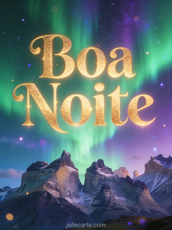 Compartilhe a maravilha do mundo com este deslumbrante cartão de boa noite com auroras boreais em tons verdes, roxos e azuis sobre picos de montanhas sob o céu estrelado. Descubra também um lindo cartão boa noite ou um cartão boa noite noite.