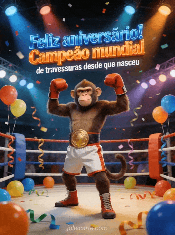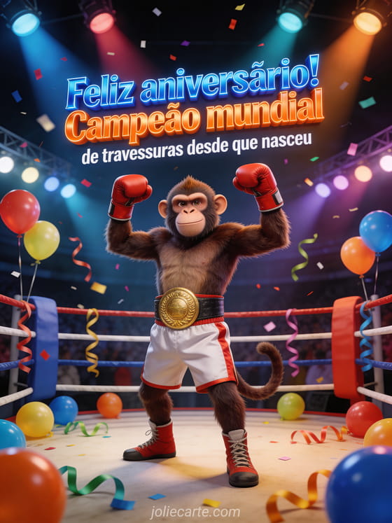 Faça-o rir com um cartão de aniversário com um macaco campeão mundial de boxe posando no ringue com cinto dourado e confetes chovendo. Descubra também engraçado feliz aniversário cachorro ou gif feliz aniversário engraçado.