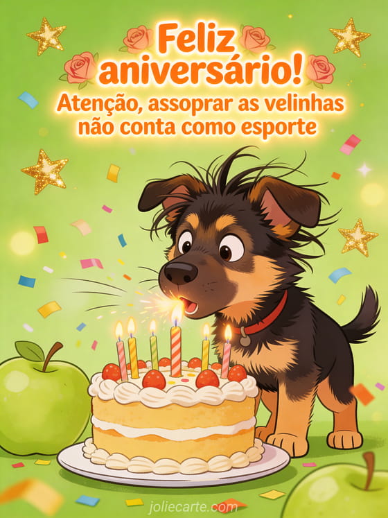 Arranque risadas com esta mensagem aniversário criança engraçada, em que um filhote pastor alemão tenta apagar velinhas teimosas de um bolo no meio de muito confete. Você também pode ver imagem cartão aniversário criança, vídeo feliz aniversário bebê e cartão aniversário festa criança.