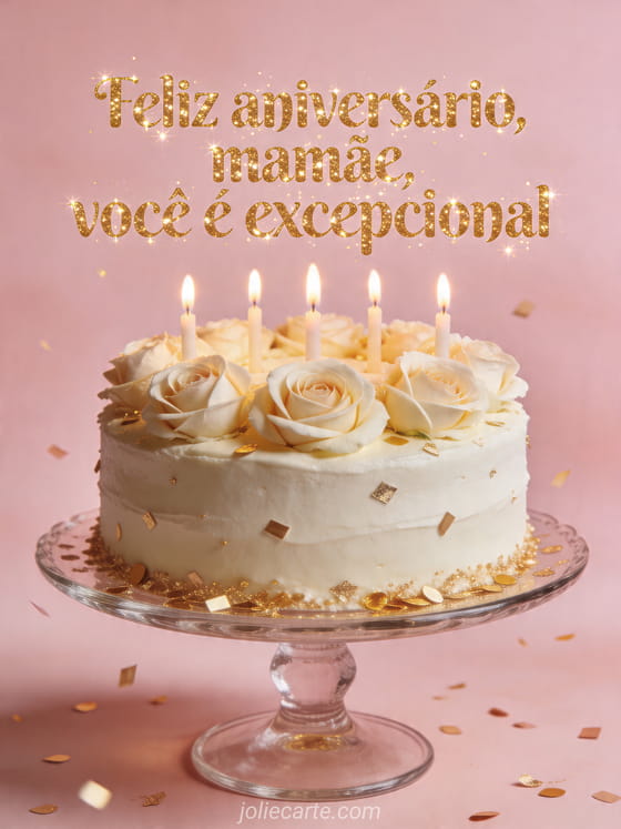 Compartilhe uma alegre mensagem de aniversário para sua mamãe com este festivo cartão de bolo coberto de rosas de creme, velas brilhantes e confetes dourados sobre fundo rosa. Descubra também cartão aniversário mamãe, feliz aniversário mamãe e texto de aniversário emocionante para mamãe.
