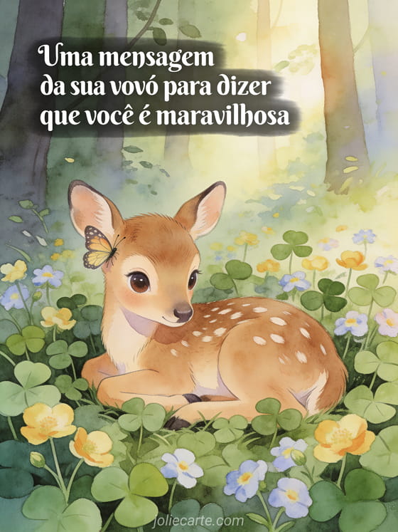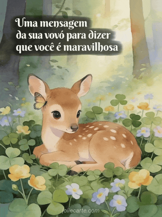 Compartilhe uma mensagem poética de aniversário da vovó com um filhote de veado delicado descansando entre trevos e margaridas, uma borboleta na orelha e luz suave de bosque. Veja também um modelo de cartão de aniversário para minha neta, um feliz aniversário minha neta cartão ou um feliz aniversário para minha neta.