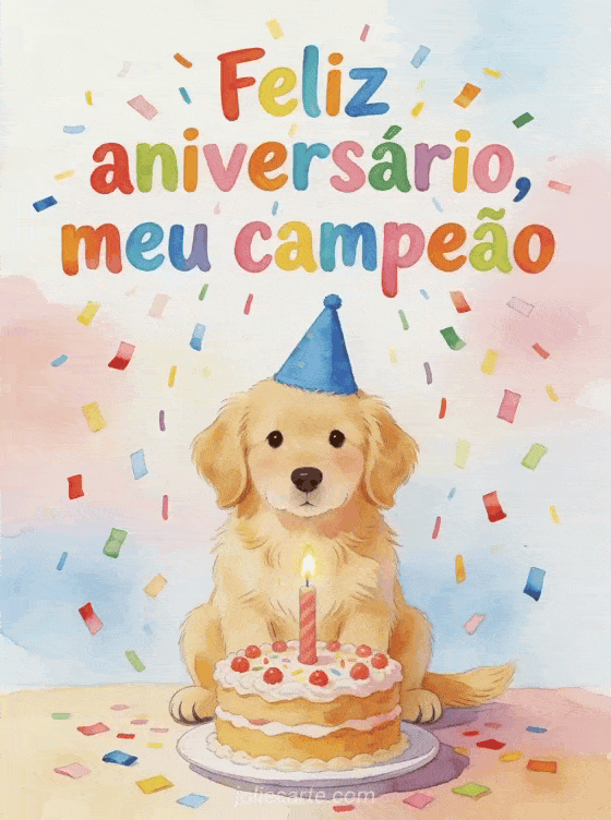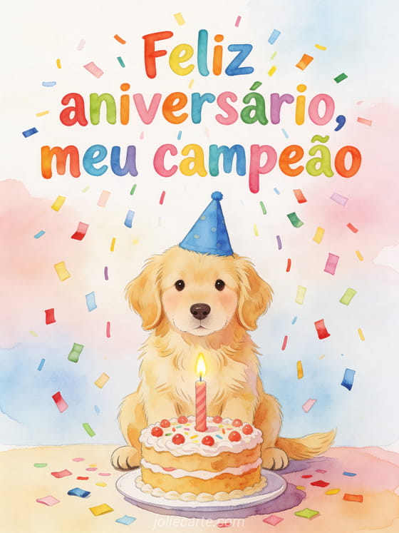 Envie uma mensagem carinhosa de aniversário para seu campeão com um adorável cachorro golden retriever, um chapéu azul de festa, um bolo com uma vela e confetes coloridos. Veja também riso sem alegria, texto de aniversário para meu neto ou aniversário neto.