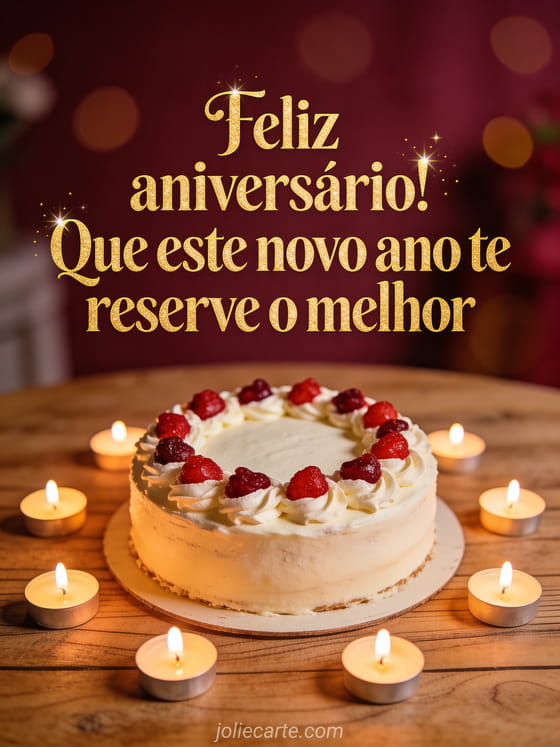 Envie uma mensagem de aniversário especial com um cartão elegante de bolo, frutas vermelhas e brilho suave de velas em tons quentes. Veja também mensagem aniversário sms, enviar uma mensagem de aniversário e mensagem de feliz aniversário.
