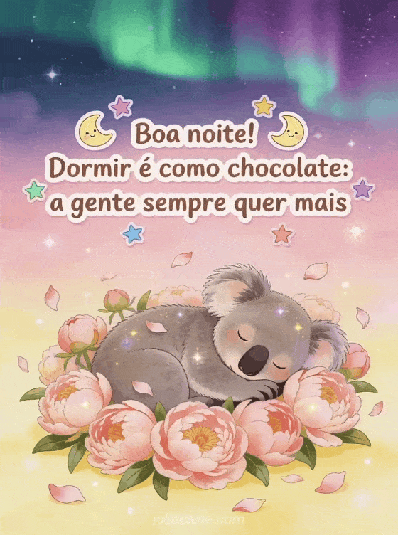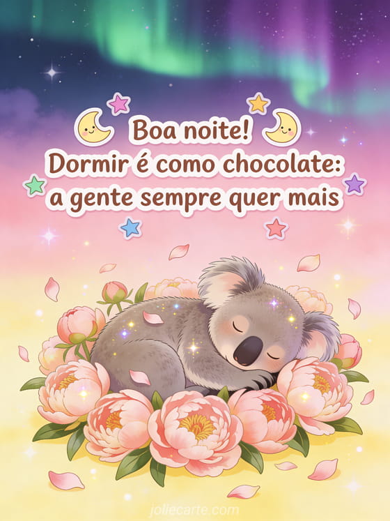 Compartilhe uma risada antes de dormir com este cartão engraçado com um coala dormindo entre peônias sob um céu de aurora boreal rosa e verde com uma divertida mensagem sobre o sono e o chocolate. Descubra também fotos de boa noite, um pensamento de boa noite ou uma mensagem de boa noite fofa.