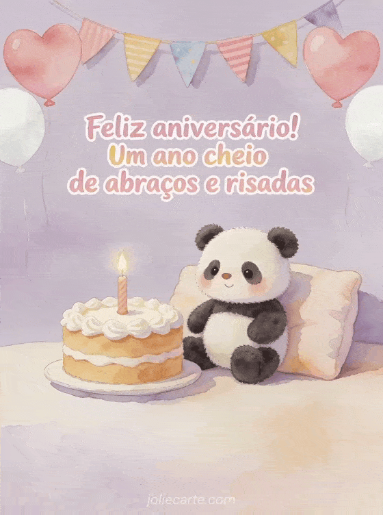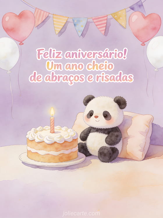 Celebre o primeiro ano de um bebê com uma ilustração suave de um panda de pelúcia em uma almofada fofinha ao lado de um bolo de aniversário com vela, bandeirinhas coloridas, balões de coração rosa e branco e um fundo lavanda acolhedor. Veja também texto primeiro aniversário bebê, feliz aniversário meu bebê ou feliz aniversário meu bebê de 1 ano.