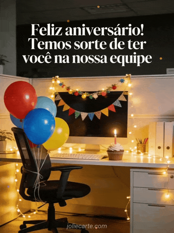 Compartilhe uma mensagem atenciosa de aniversário para um colega de trabalho com uma mesa festiva, balões coloridos, guirlanda e cupcake com vela. Você também pode enviar um feliz aniversário de uma colega de trabalho, um feliz aniversário meu colega de trabalho ou um feliz aniversário para minha colega de trabalho.