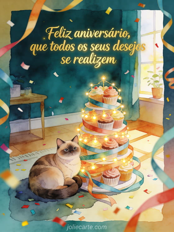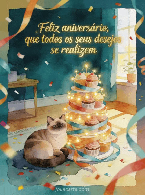 Compartilhe um cartão acolhedor de aniversário em aquarela com um gato exotic shorthair enrolado ao lado de uma torre de cupcakes com fitas e guirlandas luminosas em um quarto ensolarado, com confete e serpentinas. Veja também um aniversário do seu filho, um feliz aniversário meu filho gifs ou um cartão de aniversário grátis para meu filho.