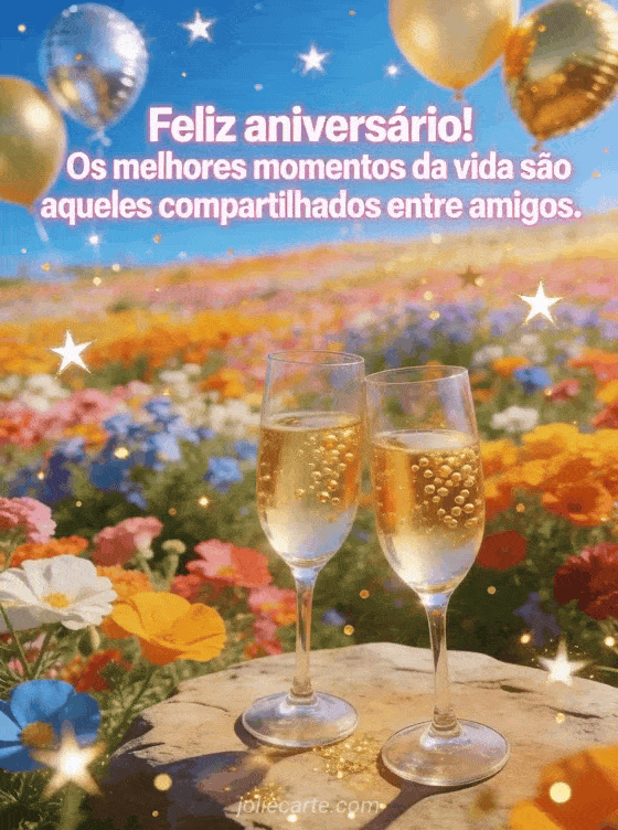 Envie este vibrante cartão de aniversário de amizade com uma superfloração de flores silvestres, taças de champanhe sobre uma rocha plana, balões dourados e prateados flutuando, e estrelas festivas cintilantes. Descubra também um cartão de aniversário para amigo ou um cartão de aniversário com balão de ar quente.